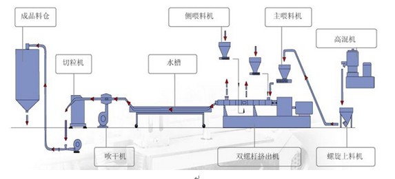 拉條切粒機(jī)組的組成結(jié)構(gòu):螺旋上料機(jī)、高混機(jī)、主喂料機(jī)、雙螺桿擠出機(jī)、側(cè)喂料機(jī)、水槽、吹干機(jī)、切粒機(jī)、成品料倉