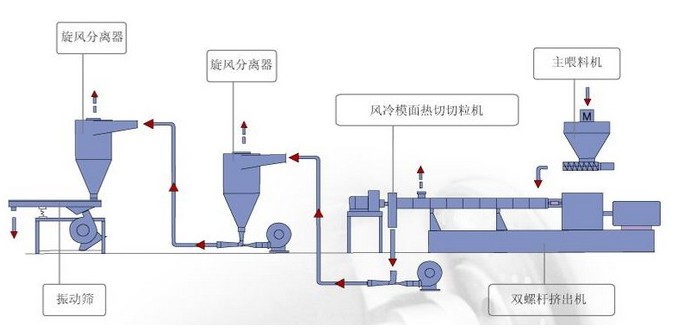 主喂料機(jī)、雙螺桿擠出機(jī)、風(fēng)冷膜面熱切切粒機(jī)、旋風(fēng)分離器(2個(gè))、振動(dòng)篩